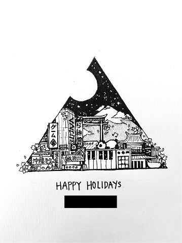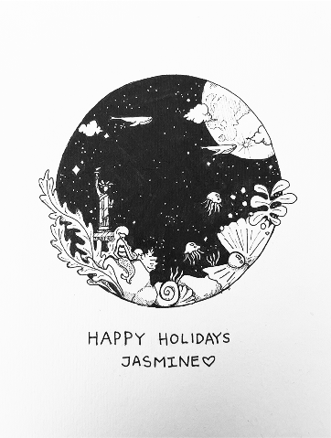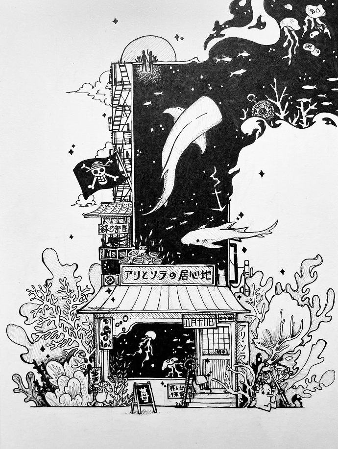 For Alice's birthday, I drew a Japanese-inspired house with elements of her favourite shows: Delicious Dungeon, One Piece, and ocean themed elements.