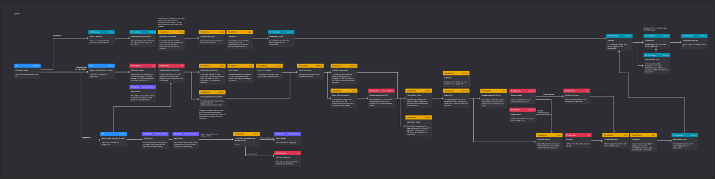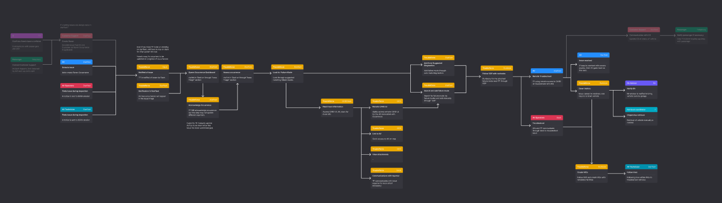 The current flow from AVs (autonomous vehicles) to different areas for troubleshooting is complex. Each color represents a different team.