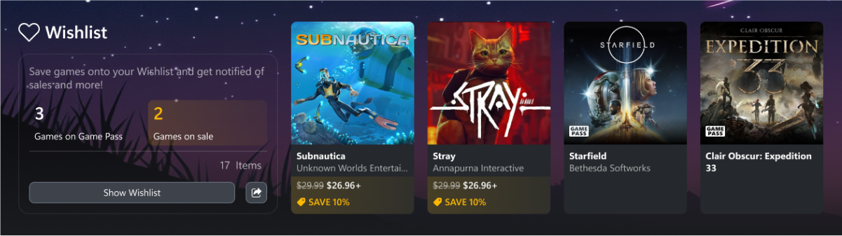 As we explored our options, we saw that our default templates didn’t support the level of detail we wanted, so we focused on surfacing key Wishlist metadata inspired by console UX in a new module. Since the goal was to create a launchpad into the Wishlist experience rather than replicate it, we simplified the module to show total games, Game Pass titles, and games on sale, with quick access share your Wishlist and to the full Wishlist page.